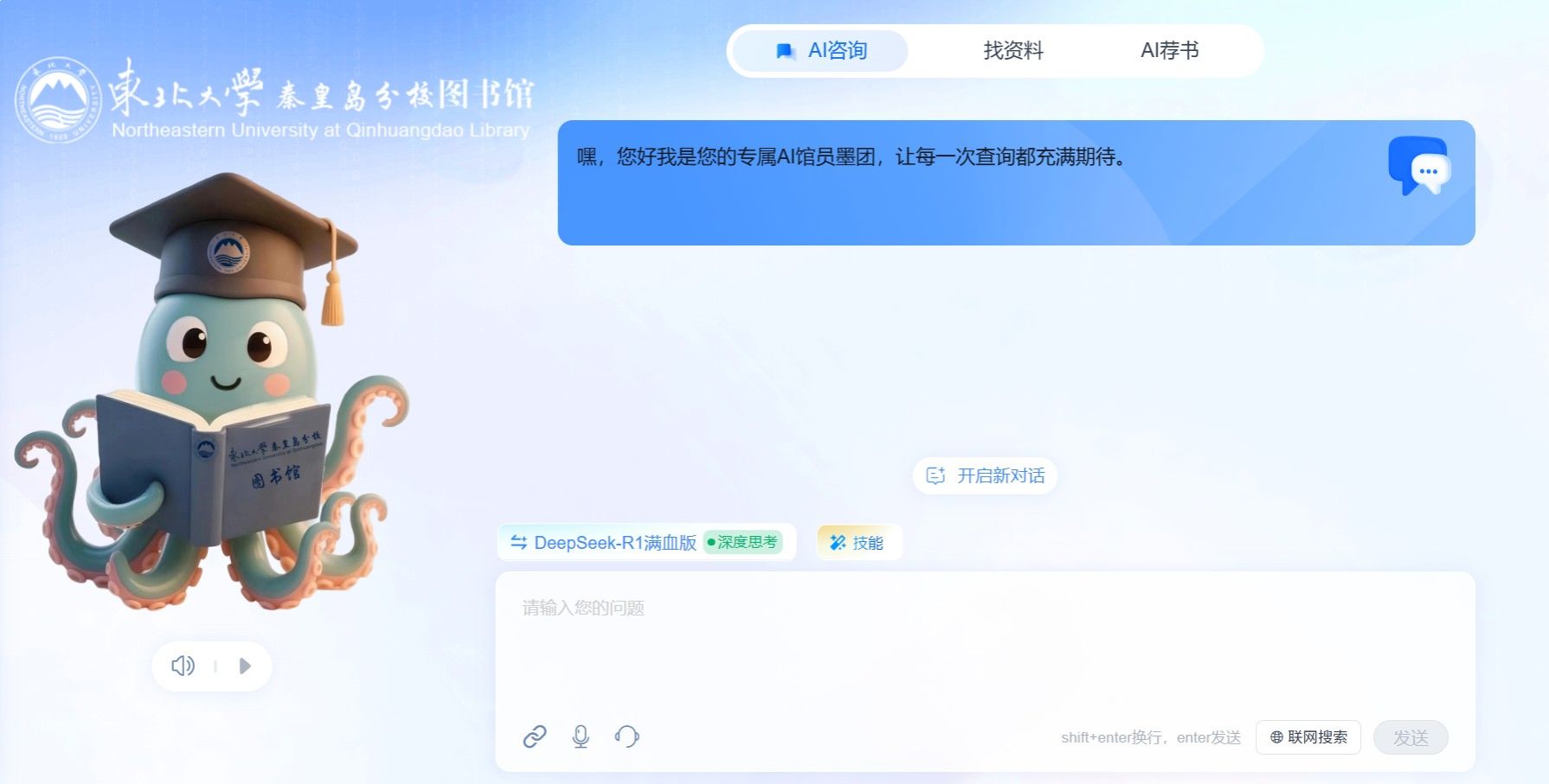 在服务功能方面,“墨团”为师生提供了智能咨询、资源定位、深度阅读、工具集成四大核心服务。智能咨询服务能够快速回应开馆时间、借阅规则等日常问题,解答多学科领域的专业学术问题;资源定位功能支持师生通过输入书名或关键词,精准获取纸质图书的馆藏架位信息,或直接跳转至电子资源在线阅读;深度阅读服务可提供个性化的书籍推荐、内容总结和细节探讨,助力师生的学术研究与深度阅读;工具集成功能提供了机器翻译、相似度检测、视频理解等实用AI工具,旨在“一站式”满足师生学习与科研中的多样化需求。