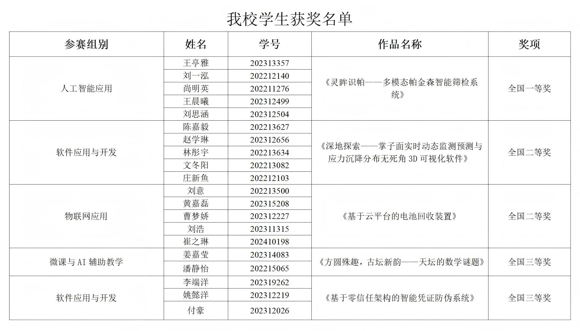 近日,2025年(第18届)中国大学生计算机设计大赛全国总决赛成绩揭晓,我校学生荣获一等奖1项、二等奖2项、三等奖2项。