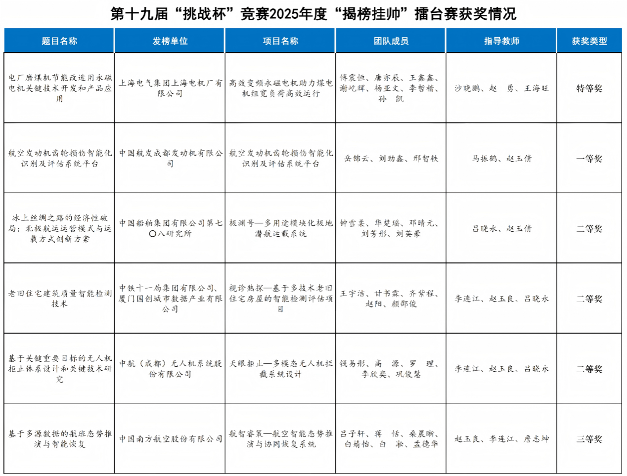 “挑战杯”全国大学生课外学术科技作品竞赛自2021年第十七届开始,设置举办“揭榜挂帅”专项赛,由企业、科研机构发榜出题,组织青年揭榜答题,以问题为导向有针对性地开展科研攻关。本届赛事由共青团中央、中国科协、教育部、中国社会科学院、全国学联共同主办,聚焦新一代信息技术、人工智能等战略性新兴产业和未来产业,分领域在全国设立8个主擂台城市、发布榜题131个,榜题数量、赛事规模、奖励条件创历届之最。经层层选拔,我校参赛作品《高效变频永磁电机助力煤电机组宽负荷高效运行》获高端装备领域特等奖;《航空发动机齿轮损伤智能化识别及评估系统平台》获高端装备领域一等奖;《极渊号—多用途模块化极地潜航运载系统》获高端装备领域二等奖、《视诊热探—基于多技术老旧住宅房屋的智能检测评估项目》获人工智能领域二等奖、《天眼拒止—多模态无人机拦截系统设计》获新一代信息技术领域二等奖;《航智睿策—航空智能态势推演与协同恢复系统》获人工智能领域三等奖。