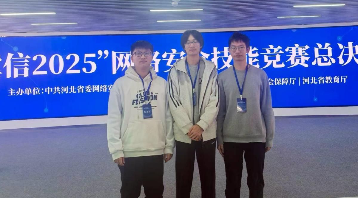 近日,“冀信2025”网络安全技能竞赛总决赛在唐山市举行。由我校学生杨雨凡、黄润森、侯宇苁组成的队伍凭借出色表现,荣获高校组一等奖。