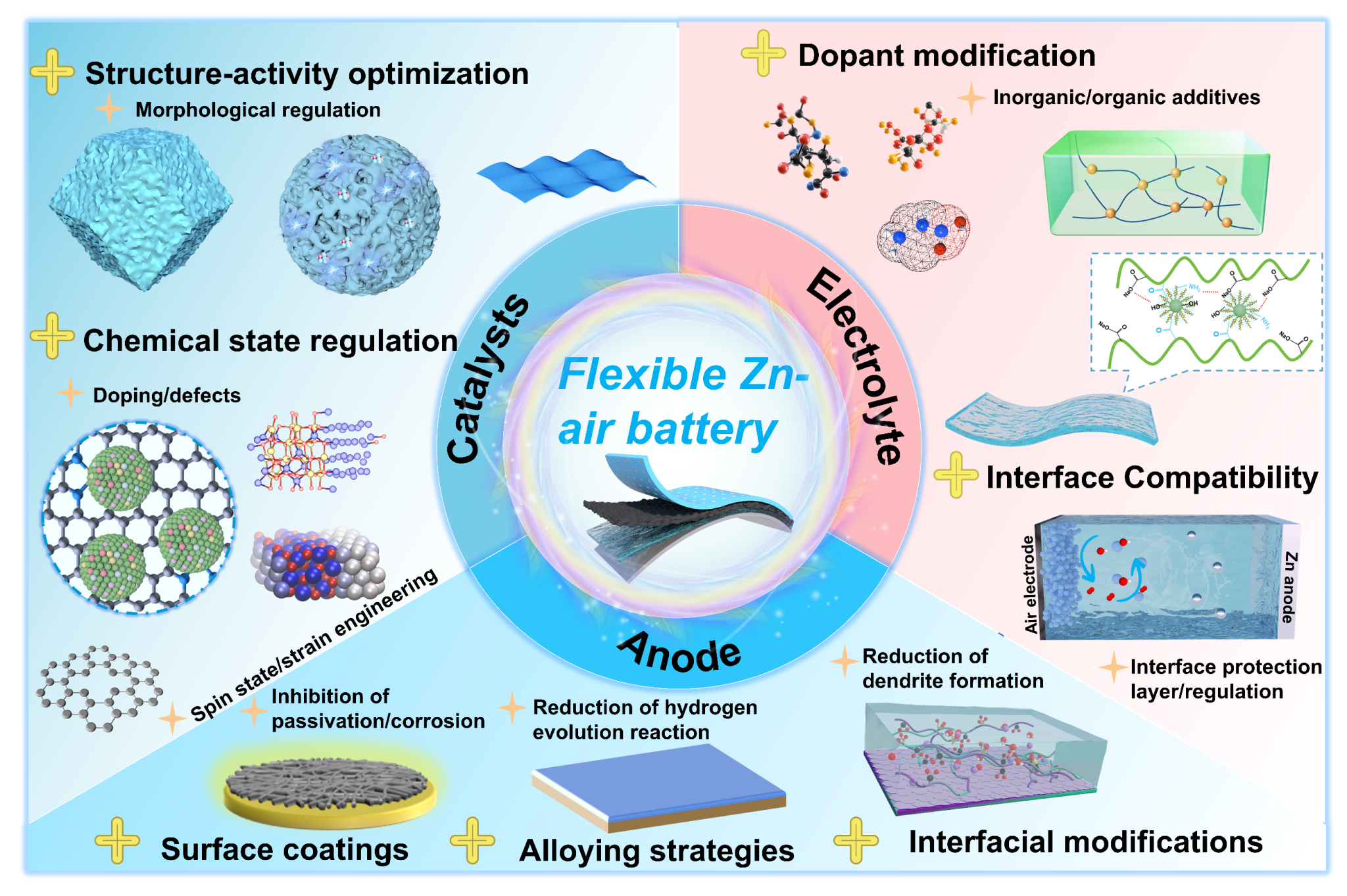 该论文围绕失效机理、基础电化学原理及多维度优化策略三个核心层面,系统总结了近年来柔性锌空气电池领域的研究进展。文章重点分析了电池各功能组件之间的耦合作用及其对整体性能的影响,并在此基础上提出了以机理为导向的协同设计原则,为柔性锌空气电池的工程化与实用化开发提供了理论指导。最后,文章针对柔性锌空气电池研究领域提出了若干可行性建议和未来发展方向,旨在为推动研究成果向实际应用转化提供战略见解,加速柔性锌空气电池从概念验证迈向下一代可穿戴设备可靠电源的进程。该项研究得到了国家自然科学基金、河北省自然科学基金、中央高校基本科研业务费以及中国国际大学生创新大赛重点项目的资助。