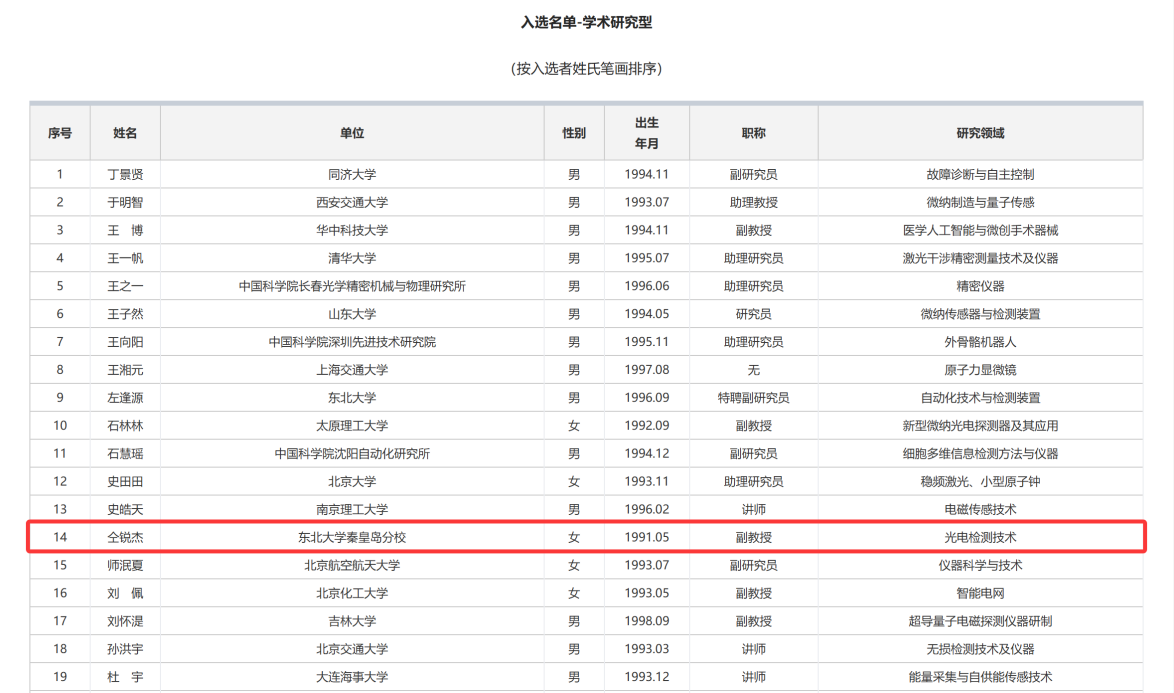 近日,中国仪器仪表学会公示了2025年青年科技人才培育计划入选者名单,我校智能感知与光电工程学院教师仝锐杰成功入选。