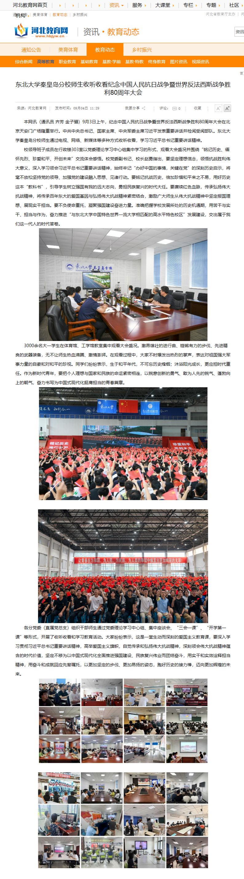 本网讯(通讯员 齐芳 金子骊)9月3日上午,纪念中国人民抗日战争暨世界反法西斯战争胜利80周年大会在北京天安门广场隆重举行。中共中央总书记、国家主席、中央军委主席习近平发表重要讲话并检阅受阅部队。东北大学秦皇岛分校师生通过电视、网络、新媒体等多种方式收听收看,学习习近平总书记重要讲话精神。