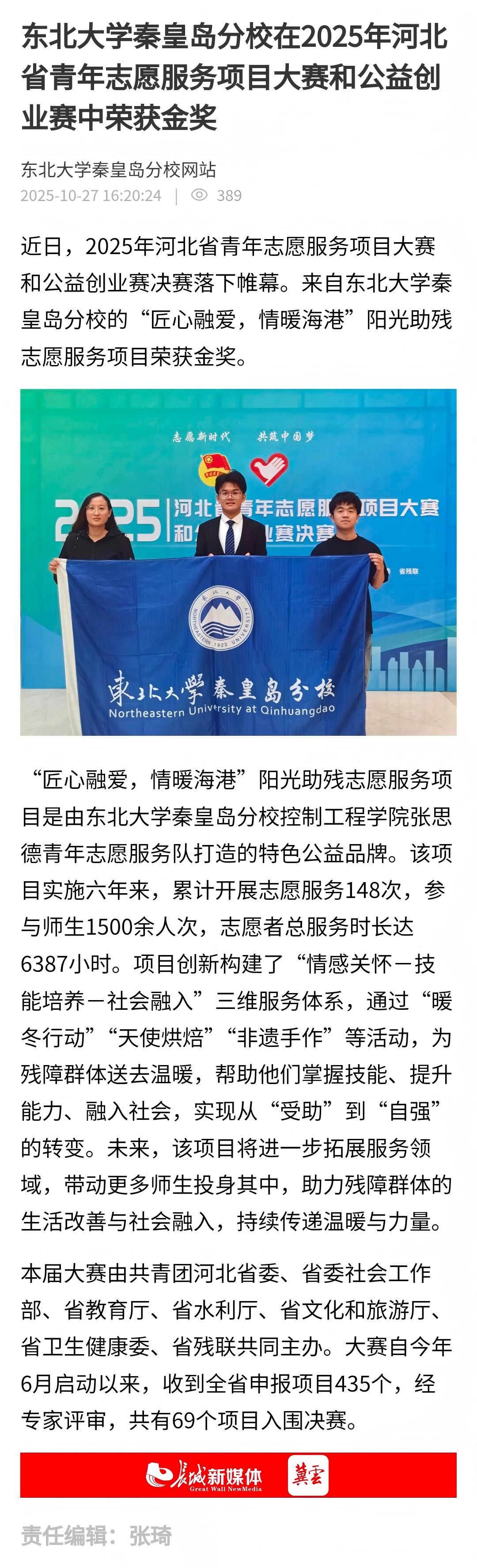 近日,2025年河北省青年志愿服务项目大赛和公益创业赛决赛落下帷幕。来自东北大学秦皇岛分校的“匠心融爱,情暖海港”阳光助残志愿服务项目荣获金奖。