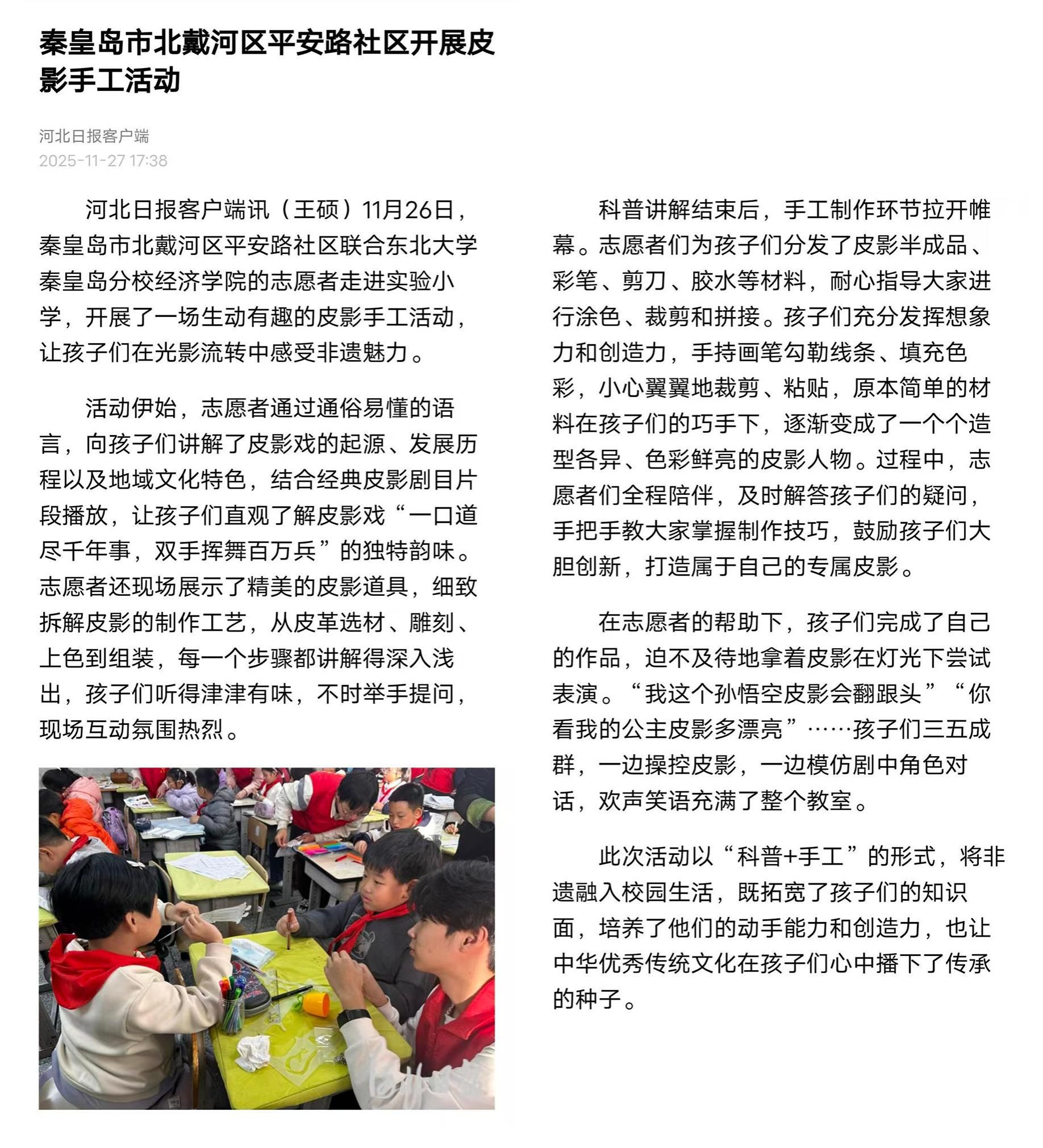 河北日报客户端讯(王硕)11月26日,秦皇岛市北戴河区平安路社区联合东北大学秦皇岛分校经济学院的志愿者走进实验小学,开展了一场生动有趣的皮影手工活动,让孩子们在光影流转中感受非遗魅力。