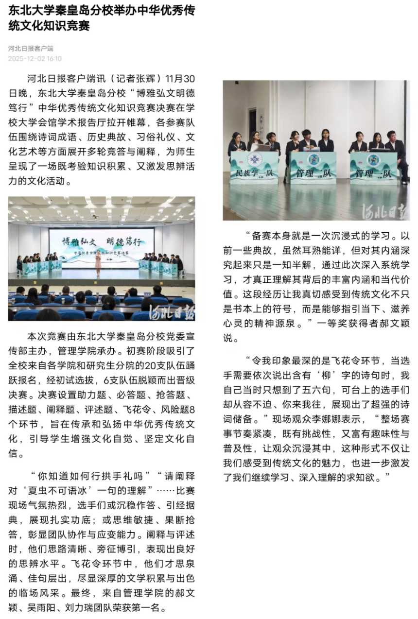 本次竞赛由东北大学秦皇岛分校党委宣传部主办,管理学院承办。初赛阶段吸引了全校来自各学院和研究生分院的20支队伍踊跃报名,经初试选拔,6支队伍脱颖而出晋级决赛。决赛设置助力题、必答题、抢答题、描述题、阐释题、评述题、飞花令、风险题8个环节,旨在传承和弘扬中华优秀传统文化,引导学生增强文化自觉、坚定文化自信。