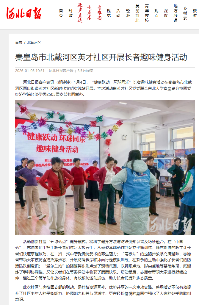 河北日报客户端讯(郝婷婷)1月4日,“健康跃动 环球同乐”长者趣味健身活动在秦皇岛市北戴河区西山街道英才社区新时代文明实践站开展。本次活动由英才社区党委联合东北大学秦皇岛分校团委经济学院经济学类2503团支部共同举办。