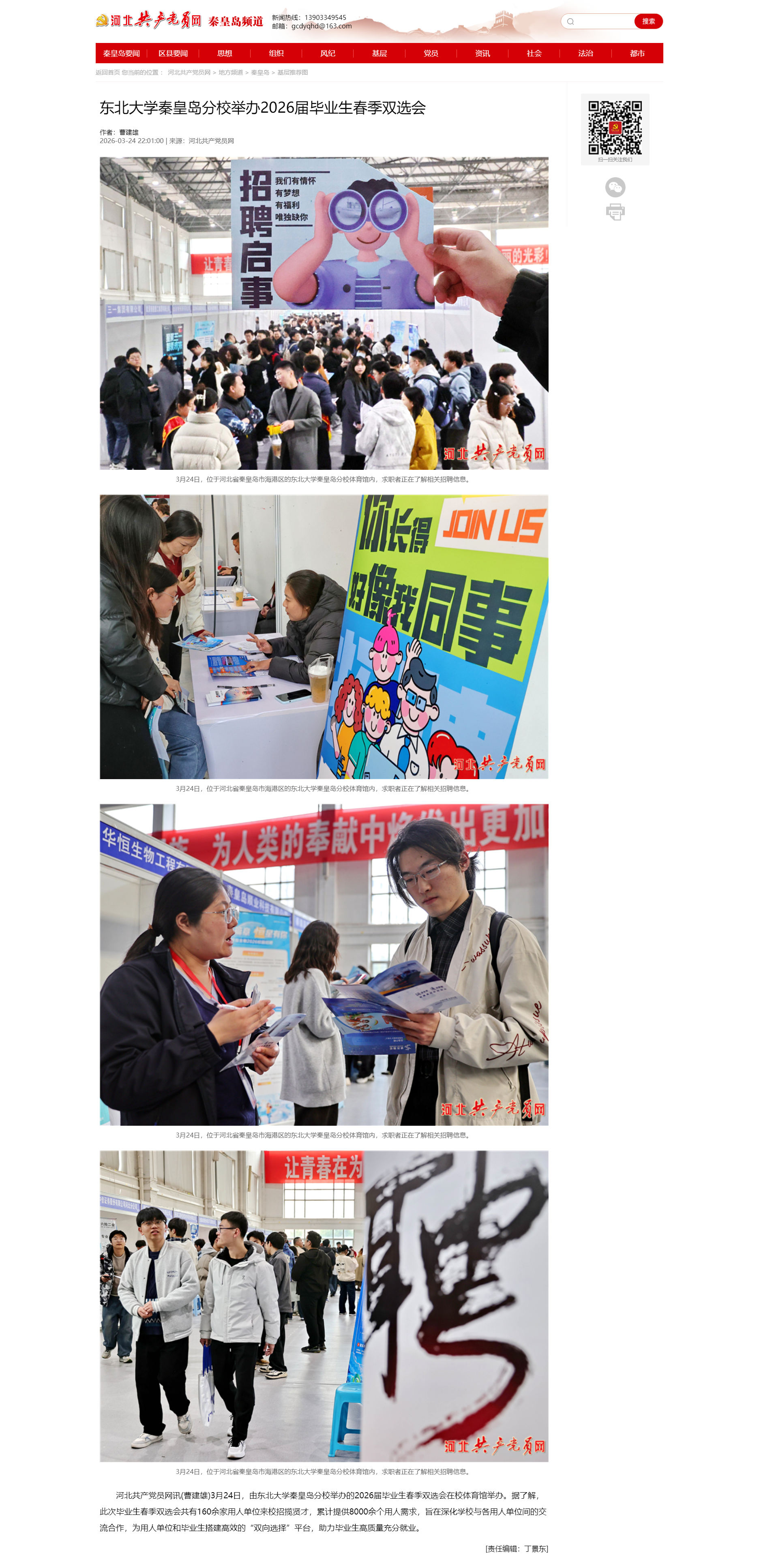 河北共产党员网讯(曹建雄)3月24日,由东北大学秦皇岛分校举办的2026届毕业生春季双选会在校体育馆举办。据了解,此次毕业生春季双选会共有160余家用人单位来校招揽贤才,累计提供8000余个用人需求,旨在深化学校与各用人单位间的交流合作,为用人单位和毕业生搭建高效的“双向选择”平台,助力毕业生高质量充分就业。