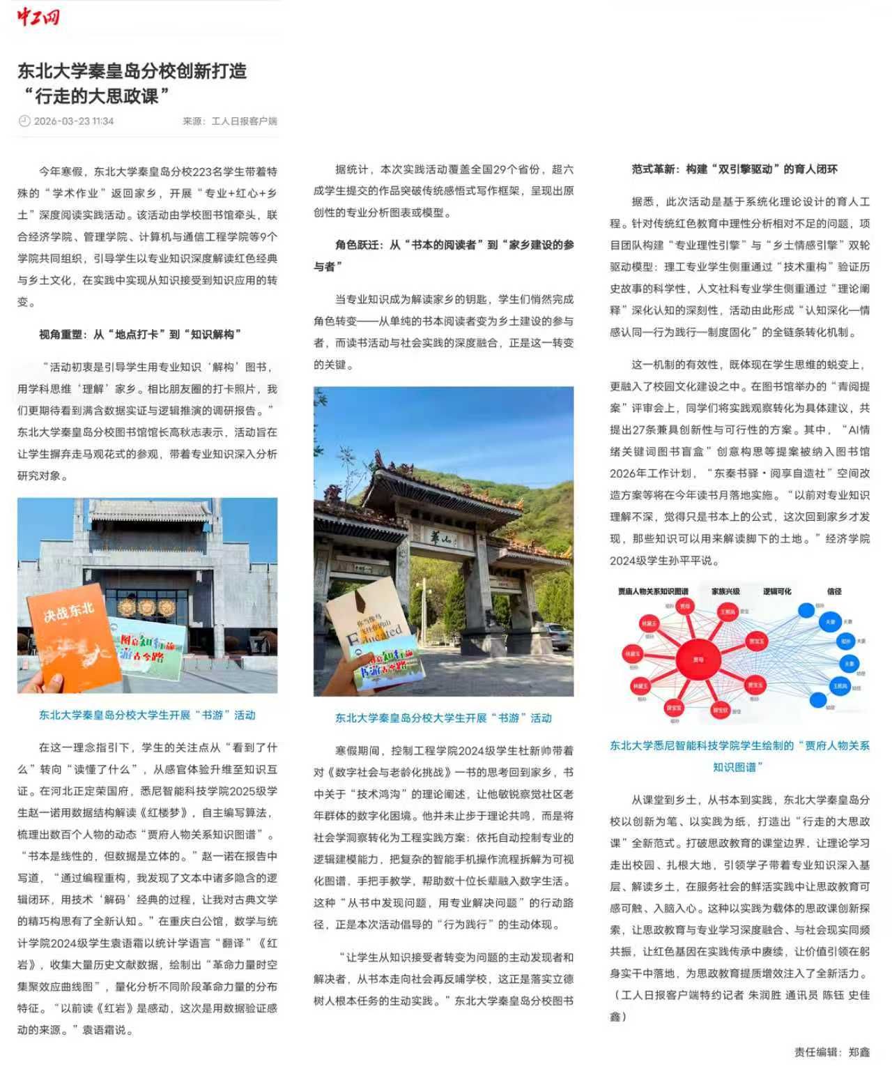 今年寒假,东北大学秦皇岛分校223名学生带着特殊的“学术作业”返回家乡,开展“专业+红心+乡土”深度阅读实践活动。该活动由学校图书馆牵头,联合经济学院、管理学院、计算机与通信工程学院等9个学院共同组织,引导学生以专业知识深度解读红色经典与乡土文化,在实践中实现从知识接受到知识应用的转变。