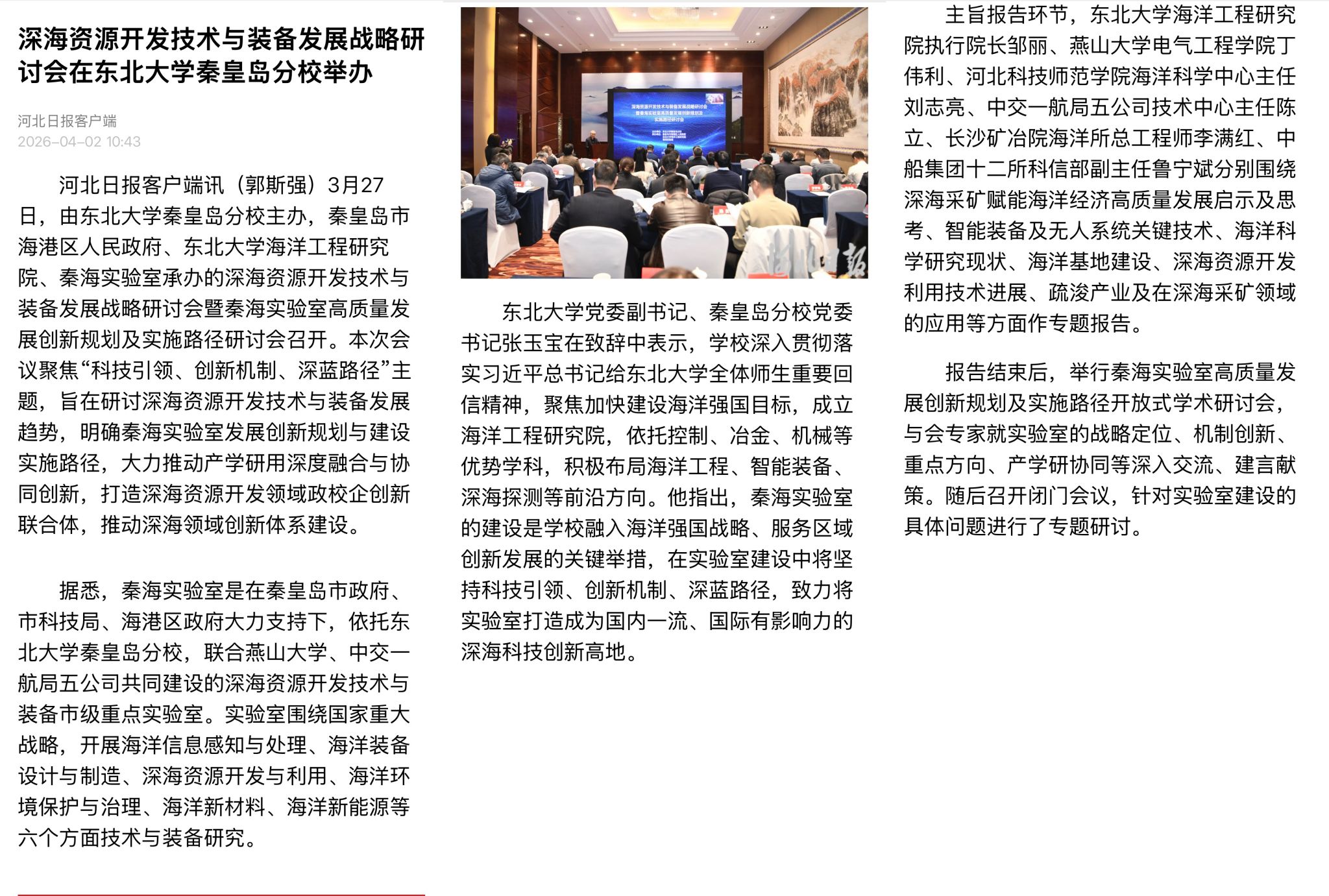河北日报客户端讯(郭斯强)3月27日,由东北大学秦皇岛分校主办,秦皇岛市海港区人民政府、东北大学海洋工程研究院、秦海实验室承办的深海资源开发技术与装备发展战略研讨会暨秦海实验室高质量发展创新规划及实施路径研讨会召开。本次会议聚焦“科技引领、创新机制、深蓝路径”主题,旨在研讨深海资源开发技术与装备发展趋势,明确秦海实验室发展创新规划与建设实施路径,大力推动产学研用深度融合与协同创新,打造深海资源开发领域政校企创新联合体,推动深海领域创新体系建设。