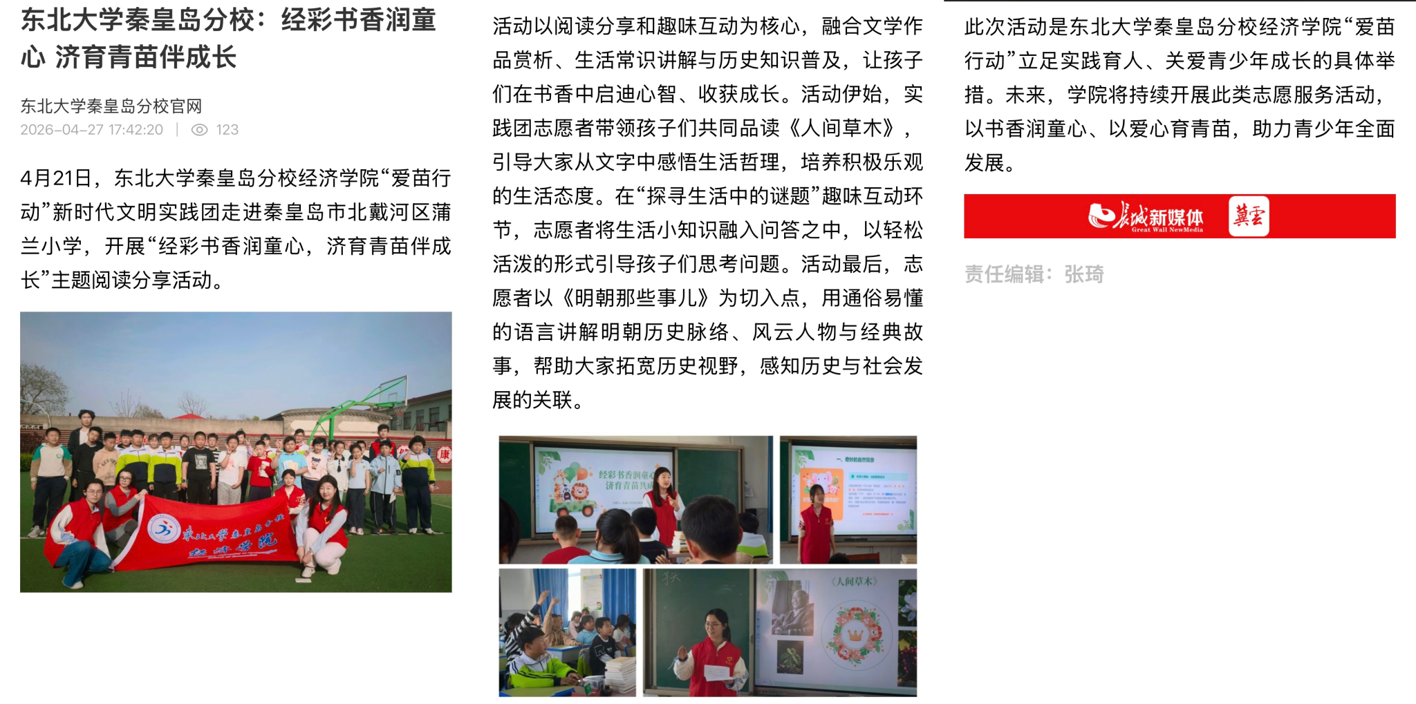 此次活动是东北大学秦皇岛分校经济学院“爱苗行动”立足实践育人、关爱青少年成长的具体举措。未来,学院将持续开展此类志愿服务活动,以书香润童心、以爱心育青苗,助力青少年全面发展。